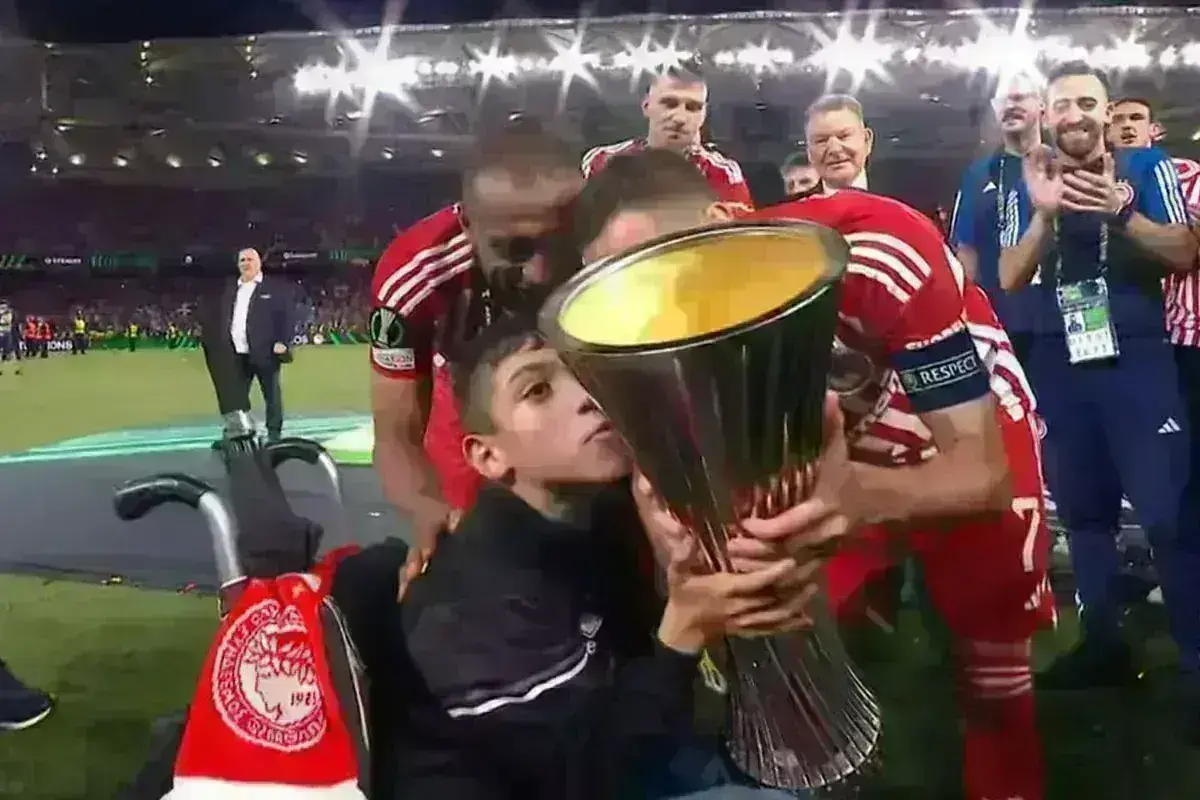 Στον γύρο του θριάμβου κι έπειτα από την απονομή κατευθύνθηκε προς τον μικρό Γιαννάκη, τον γνωστό φίλο του ΠΑΟΚ με αναπηρία, που ήταν επίτιμος προσκεκλημένος στον τελικό και του έδωσε το τρόπαιο για να το σηκώσει κι αυτός.