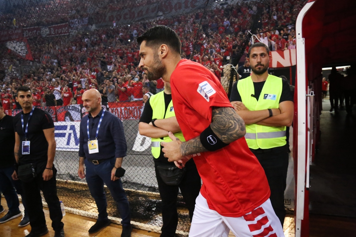 Όπως φροντίζει πάντα πριν από τα τζάμπολ των αγώνων, ο αρχηγός του Ολυμπιακού, Γιώργος Πρίντεζης, φρόντισε να πορώσει τους συμπαίκτες του πριν την είσοδο στο παρκέ.
