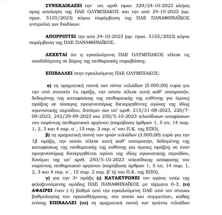 ΣΥΝΕΚΔΙΚΑΖΕΙ την υπ. αριθμ. πρωτ 329/24-10-2023 κλήση προς απολογία της ΠΑΕ Ολυμπιακός και την από 24-10-2023 (αρ. πρωτ 5155/2023) κύρια παρέμβαση της ΠΑΕ Παναθηναϊκός αντιμολιά των διαδίκων.