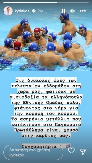 «Τις δύσκολες ώρες των τελευταίων εβδομάδων στη χώρα μας, φώτισαν με αισιοδοξία τα ελληνόπουλα της Εθνικής Ομάδας πόλο, φτάνοντας στο νήμα για την κορυφή του κόσμου» αναφέρει σε ανάρτησή του ο πρωθυπουργός Κυριάκος Μητσοτάκης τονίζοντας ότι το ασημένιο μετάλλιο που κατέκτησαν στο Παγκόσμιο Πρωτάθλημα είναι χρυσό στις καρδιές μας.