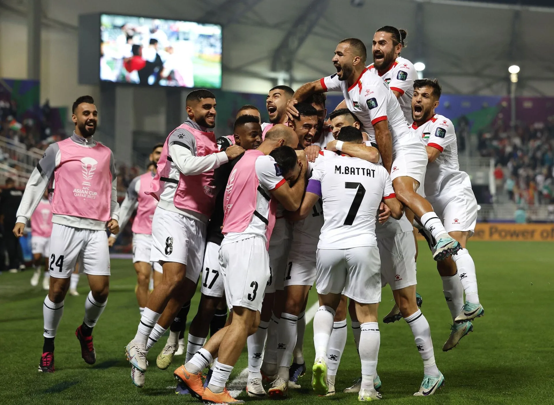 Καθ’ όλη τη διάρκεια του αγώνα, το πλήθος των 6.500 φιλάθλων στο Κατάρ υποστήριξε την παλαιστινιακή ομάδα και στο σφύριγμα της λήξης οι παίκτες ξέσπασαν σε δάκρυα χαράς. Ο αμυντικός Μοχάμεντ Σαλέχ, ο οποίος γεννήθηκε στη Γάζα, απεικονίστηκε σε φωτογραφία να κλαίει και να γονατίζει στο έδαφος, με το πρόσωπό του στο γρασίδι.