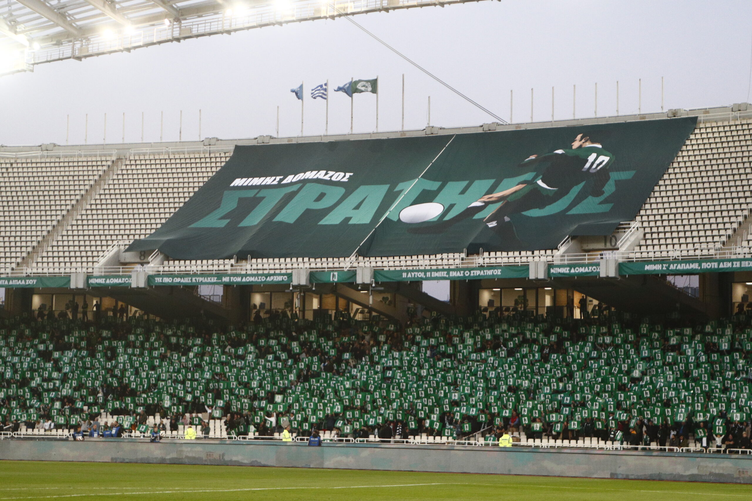 Πριν από τη σέντρα όλη η ποδοσφαιρική ομάδα του Παναθηναϊκού πέρασε μπροστά απ’ τη φυσούνα όπου υπήρχε μία μεγάλη φωτογραφία του «Στρατηγού» και λουλούδια, ακριβώς κάτω απ’ τη θέση στα VIP που καθόταν πάντα ο Μίμης Δομάζος μαζί με τον «Διόσκουρό» του Αντώνη Αντωνιάδη κι έβλεπαν παρέα τους αγώνες του αγαπημένου τους Παναθηναϊκού.