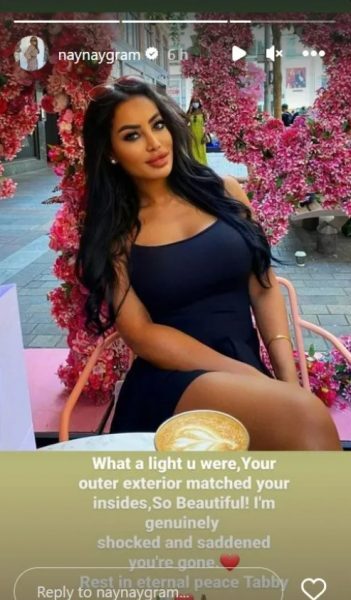 «Ήσουν φως, το εξωτερικό σου ταίριαζε με το εσωτερικό σου, τόσο όμορφο. Είμαι πραγματικά σοκαρισμένος και λυπημένος που έφυγες. Αναπαύσου σε αιώνια ειρήνη Tabby», έγραψε χαρακτηριστικά η NayNay.