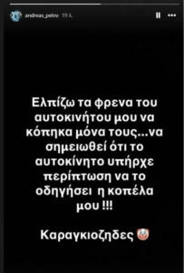 Συγκεκριμένα έγραψε: «Ελπίζω τα φρένα του αυτοκινήτου μου να κόπηκαν μόνα τους». Στην ίδια ανάρτηση ανέφερε ότι το αυτοκίνητο επρόκειτο να το οδηγήσει η κοπέλα του και προσέθεσε την αιχμηρή λέξη «καραγκιόζηδες» για να περιγράψει τους υπεύθυνους, όπως τους χαρακτήρισε.