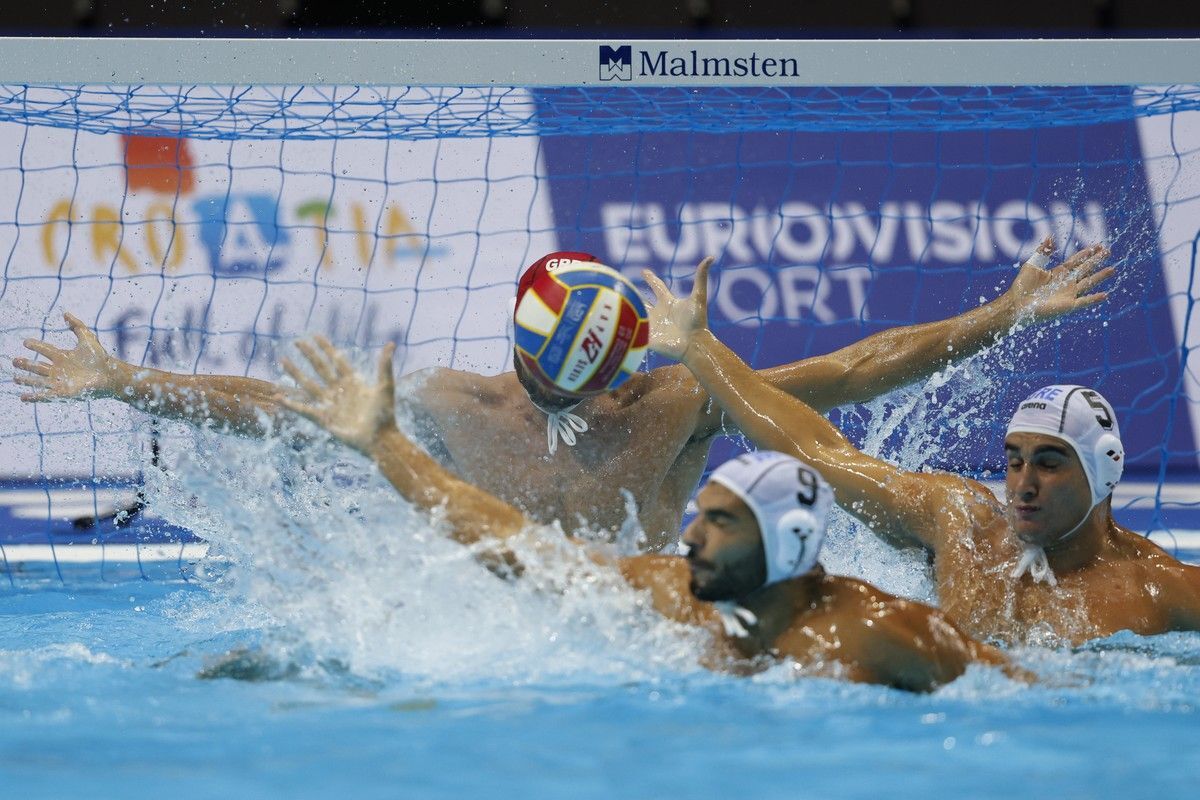 Οι Ισπανοί μπήκαν καλύτερα στο ματς και προηγήθηκαν 2-0 με τέρματα από τους Φαμέρα και Καμπάνιας. Η Εθνική απάντησε με γκολ των Γενηδουνιά και Βλαχόπουλου, όμως οι Γρανάδος και Μουνιαριθ έδωσαν εκ νέου προβάδισμα δύο τερμάτων στους Ισπανούς. Το 4-2 ήταν και το τελικό σκορ της πρώτης περιόδου με τον Αγκίρε να αποκρούει πέναλτι του Αργυρόπουλου με δύο δευτερόλεπτα να απομένουν.