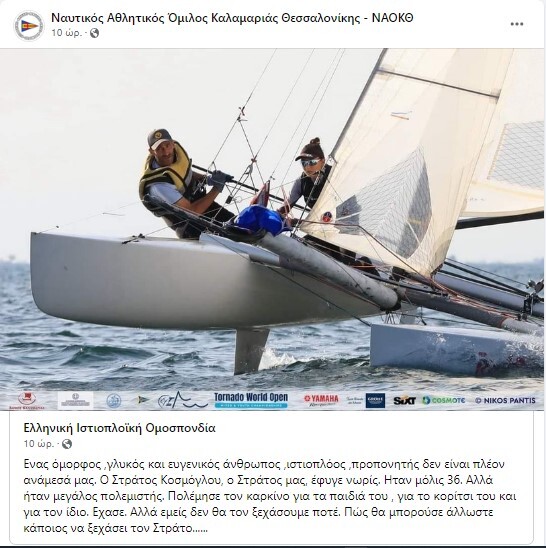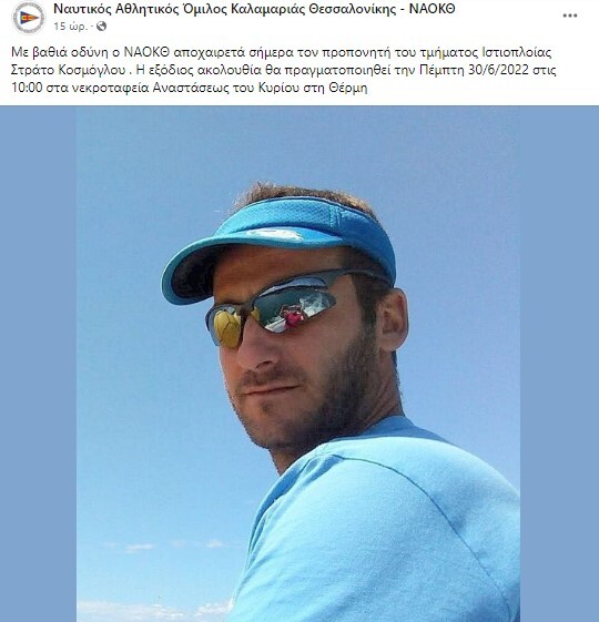 «Με βαθιά οδύνη ο ΝΑΟΚΘ αποχαιρετά σήμερα τον προπονητή του τμήματος Ιστιοπλοΐας Στράτο Κοσμόγλου. Η εξόδιος ακολουθία θα πραγματοποιηθεί την Πέμπτη 30/6/2022 στις 10:00 στα νεκροταφεία Αναστάσεως του Κυρίου στη Θέρμη».
