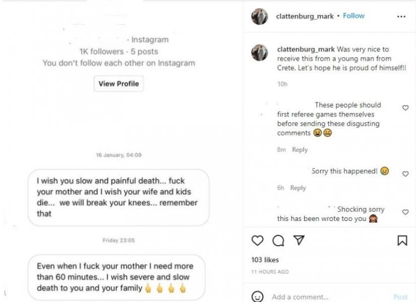 Ο Άγγλος αρχιδιαιτητής ανέβασε στο instagram μηνύματα που έχει δεχθεί από συγκεκριμένο follower, μέσω των οποίων εκείνος εύχεται αργό θάνατο στον ίδιο και την οικογένειά του, ενώ αναφέρει επίσης «θα σου σπάσουμε τα γόνατα».