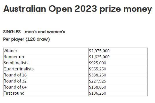 Υπενθυμίζεται ότι ο νικητής του Australian Open θα πάρει 2.975.000 δολάρια, ενώ ο φιναλίστ θα βάλει στον τραπεζικό του λογαριασμό περίπου 1.625.000 δολάρια.