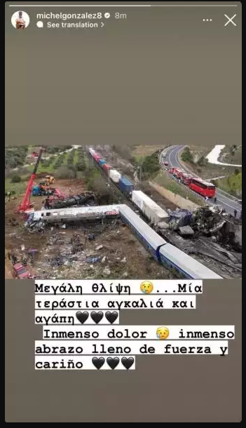«Μεγάλη θλίψη. Μία τεράστια αγκαλιά και αγάπη», έγραψε χαρακτηριστικά Μίτσελ στα ελληνικά, συνοδεύοντας έτσι μια φωτογραφία που απεικονίζει τον τόπο του σοκαριστικού δυστυχήματος.
