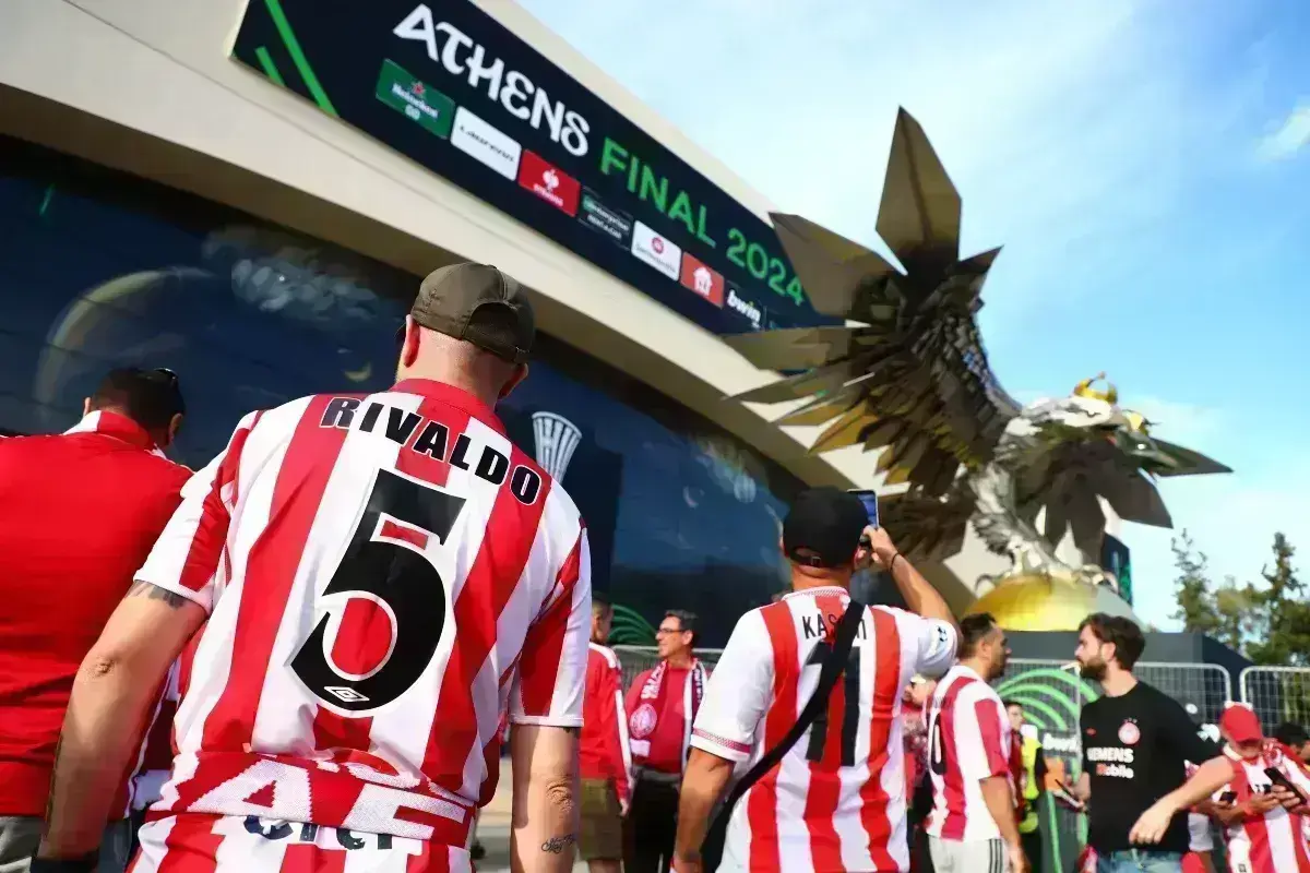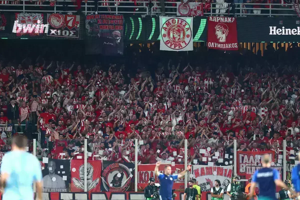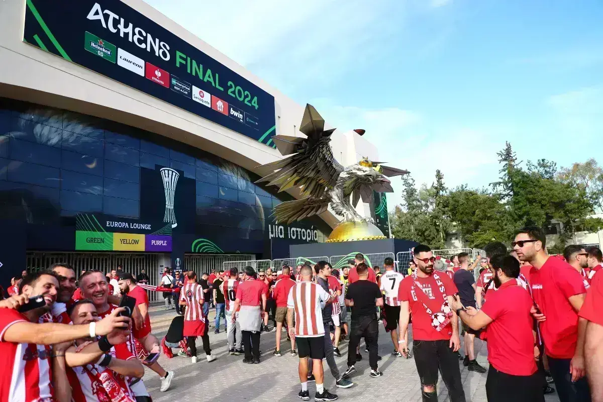 Σχεδόν 20.000 οπαδοί των «ερυθρόλευκων» που έχουν βρίσκονται από πολύ νωρίς στις κερκίδες της OPAP Arena για να παρακολουθήσουν από κοντά τον τελικό του Conference League, έχουν δημιουργήσει υπέροχη ατμόσφαιρα, τραγουδώντας ασταμάτητα για την αγαπημένη τους ομάδα.