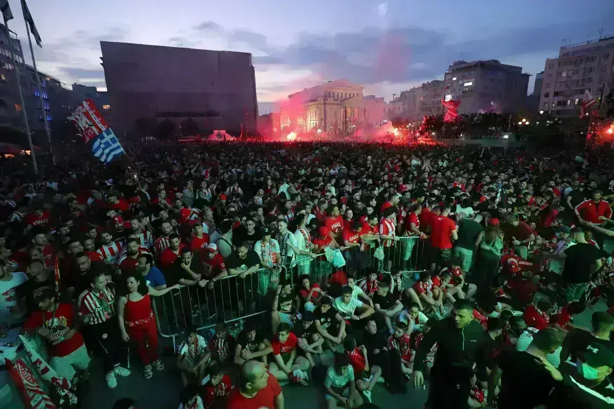 Χιλιάδες οπαδοί του Ολυμπιακού έχουν συγκεντρωθεί στην Πλατεία «Κοραή» απέναντι από το Δημοτικό Θέατρο Πειραιά περιμένοντας με τεράστια ανυπομονησία τη σέντρα του μεγάλου τελικού του Conference League με την Φιορεντίνα
