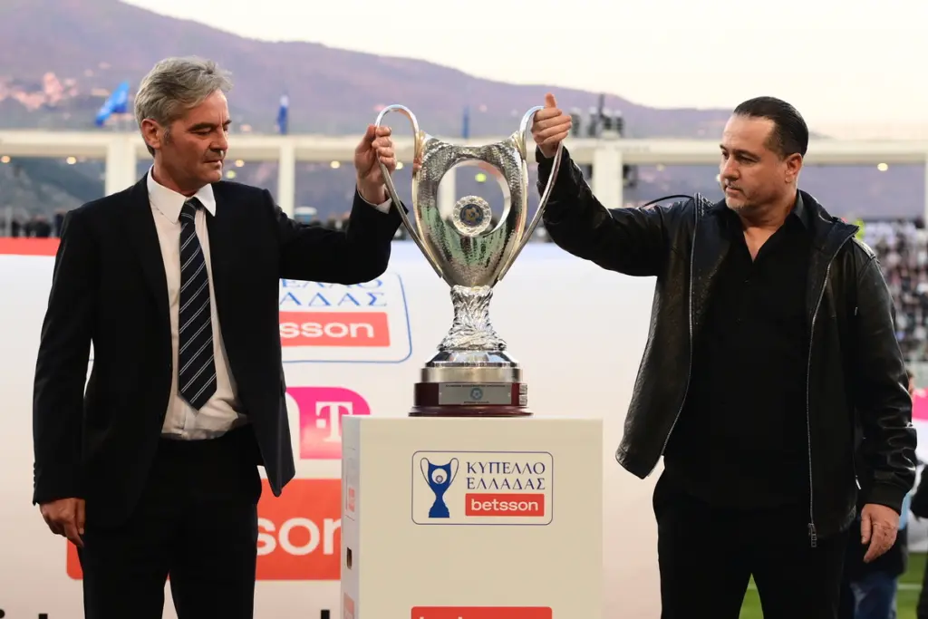 Το βαρύτιμο τρόπαιο του Κυπέλλου Ελλάδας θα φέρουν στο γήπεδο οι πρώην διεθνείς παίκτες του ΠΑΟΚ, Ζήσης Βρύζας και του ΟΦΗ, Νίκος Μαχλάς, ενώ το τρόπαιο θα τοποθετηθεί στο σημείο της απονομής από τον εκπρόσωπο της νικήτριας ομάδας.