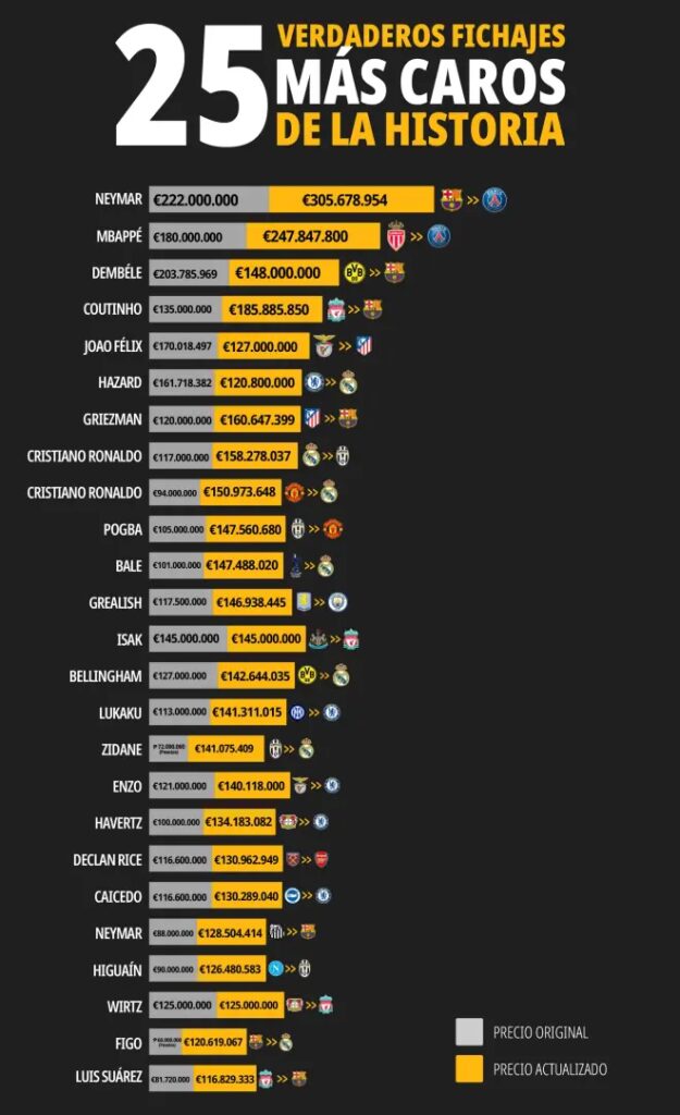 Η κατάταξη που προκύπτει προκαλεί αναθεώρηση της ιστορίας των πιο ακριβών μεταγραφών, καθώς οκτώ από τις δέκα ακριβότερες μεταγραφές όλων των εποχών, όταν υπολογιστούν με τις σημερινές αξίες, αφορούν ισπανικούς συλλόγους. Τα ευρήματα δεν περιορίζονται σε τιμές ρεκόρ αλλά αλλάζουν τη σχετική θέση παικτών και συλλόγων στον χάρτη των οικονομικών μετακινήσεων.