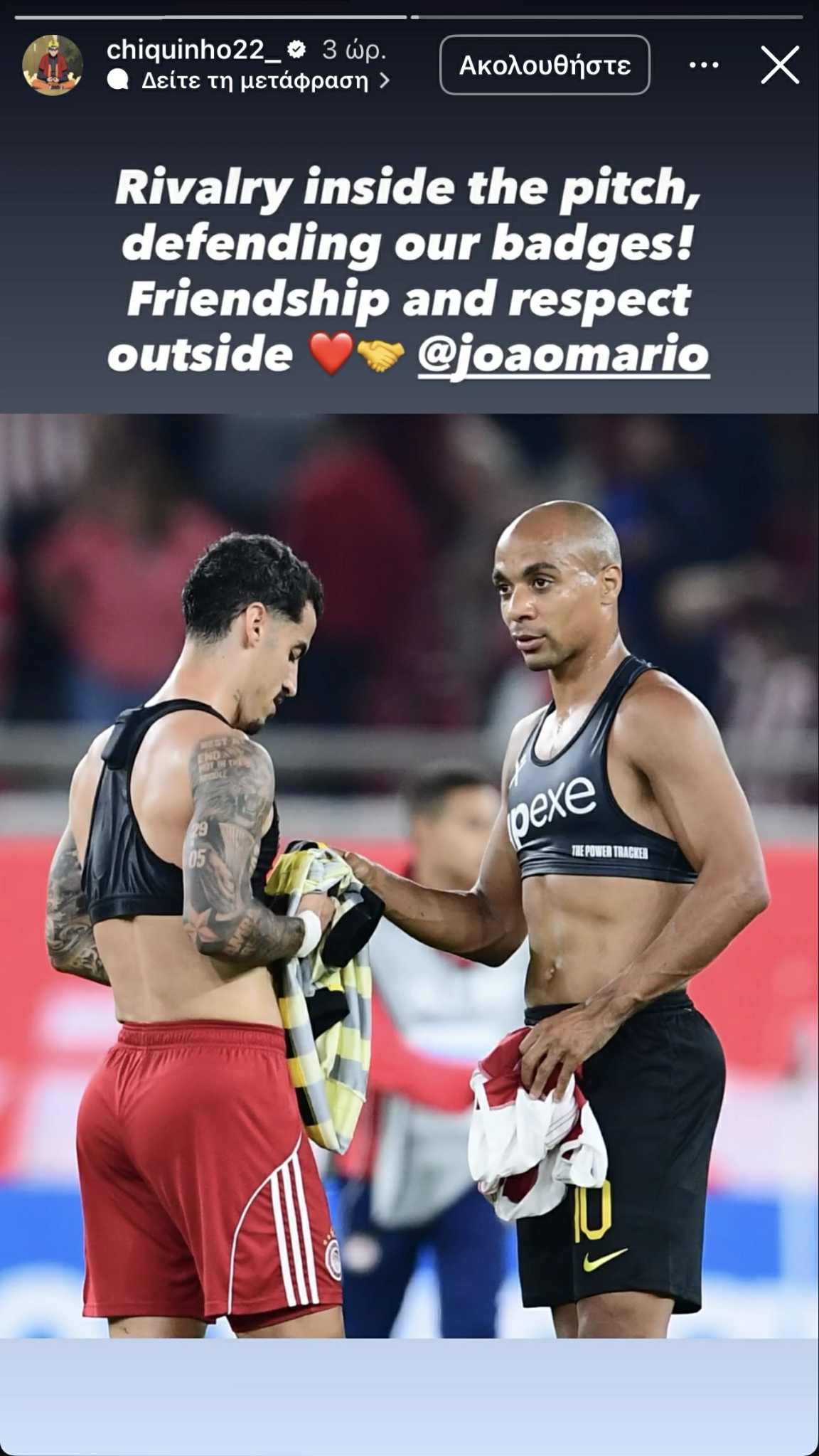 Ο Τσικίνιο ανάρτησε τη φωτογραφία στο Instagram με το μήνυμα: «Αντιπαλότητα μέσα στο γήπεδο, υπεράσπιση των εμβλημάτων μας! Φιλία και σεβασμός έξω από αυτό». Ένα απλό μήνυμα που υπενθυμίζει πως ο ανταγωνισμός στο χορτάρι δεν αναιρεί τις σχέσεις και τον σεβασμό έξω από αυτό.