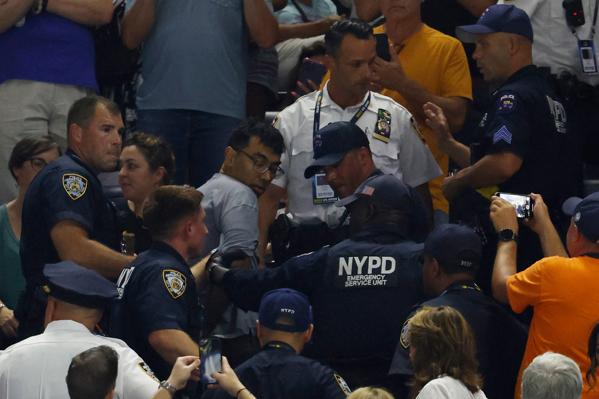 Λίγο πριν το δεύτερο game στο δεύτερο σετ, τρία άτομα σηκώθηκαν στο πάνω μέρος της εξέδρας και φώναξαν «τέλος στα ορυκτά καύσιμα».