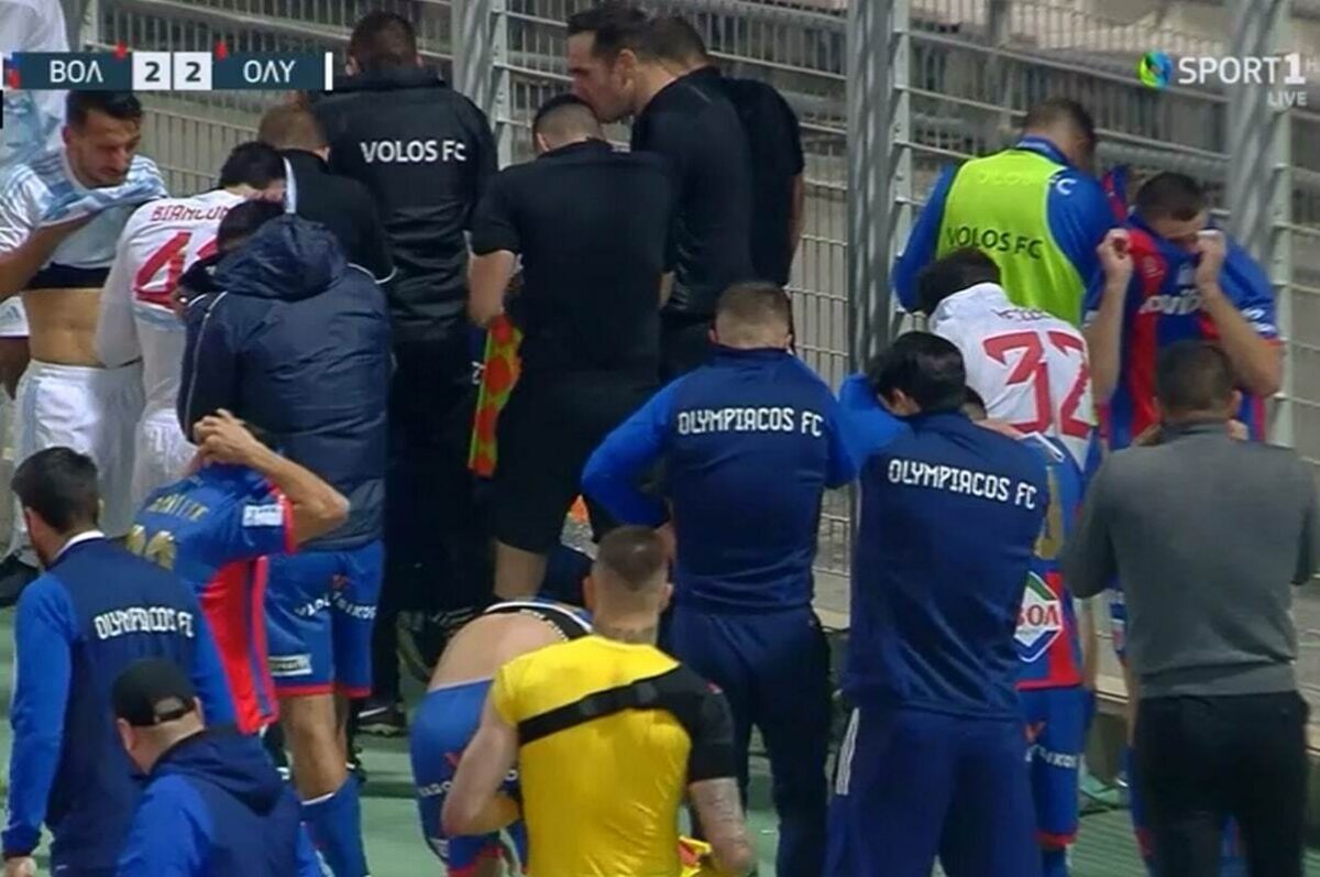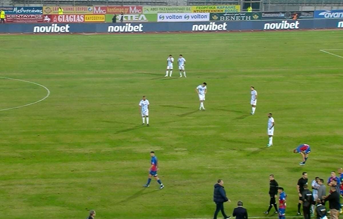 Στο πέμπτο λεπτό των καθυστερήσεων ο διαιτητής Παπαπέτρου διέκοψε το παιχνίδι καθώς ξεκίνησε ένταση μεταξύ των οπαδών του Ολυμπιακού και των αστυνομικών δυνάμεων, οι οποίες στη συνέχεια έκαναν και χρήση δακρυγόνων! Οι αστυνομικές δυνάμεις μπήκαν στο γήπεδο, με τους οπαδούς του Ολυμπιακού από το πέταλο να πετάνε καθίσματα προς τα ΜΑΤ.
