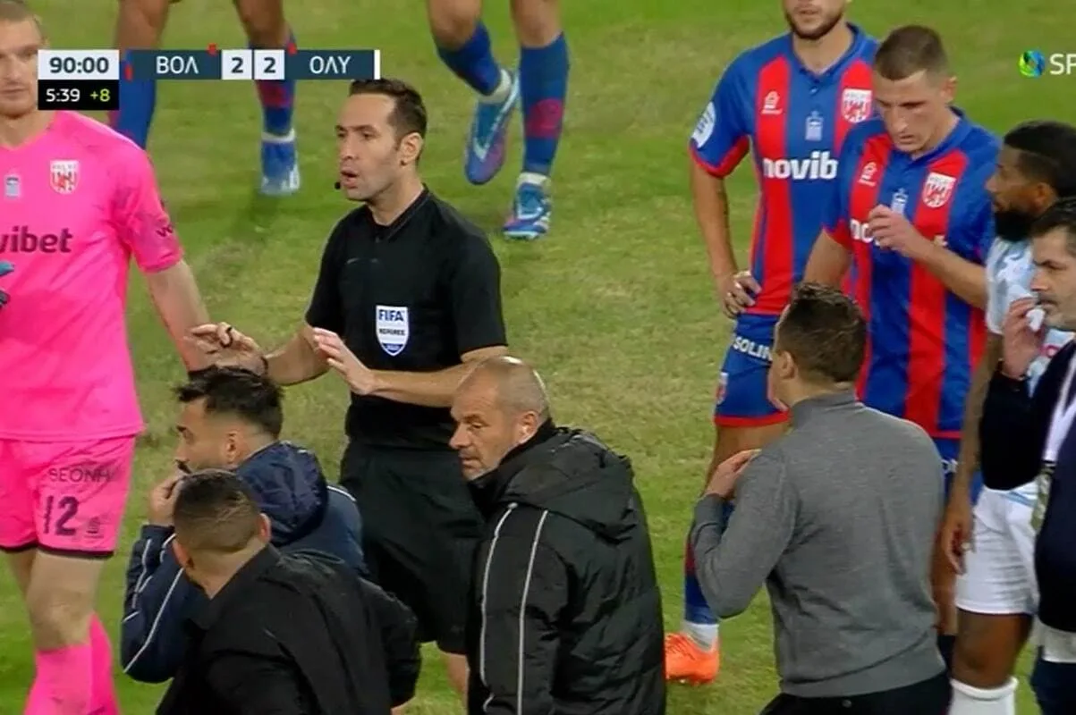 Τα επεισόδια εντάθηκαν, ενώ ακούγονταν κρότου λάμψης, με την αστυνομική παρουσία να γίνεται ακόμα πιο ισχυρή και τους οπαδούς των ερυθρολεύκων να συνεχίζουν τη ρίψη αντικειμένων και φωτοβολίδων.