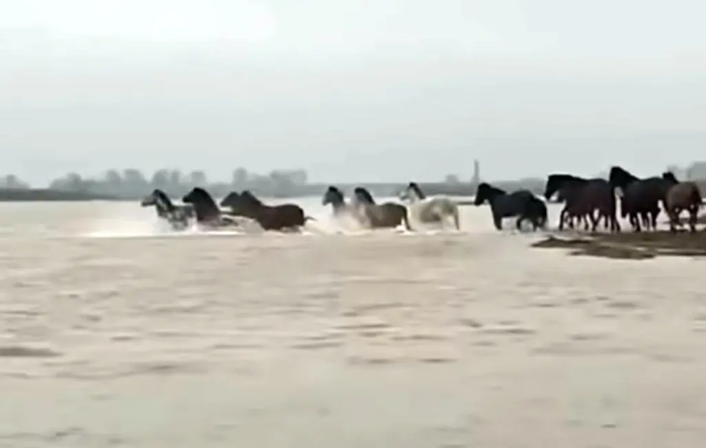 Σπάνιο θέαμα στο Δέλτα του Έβρου: Άγρια άλογα διασχίζουν τα φουσκωμένα νερά του ποταμού