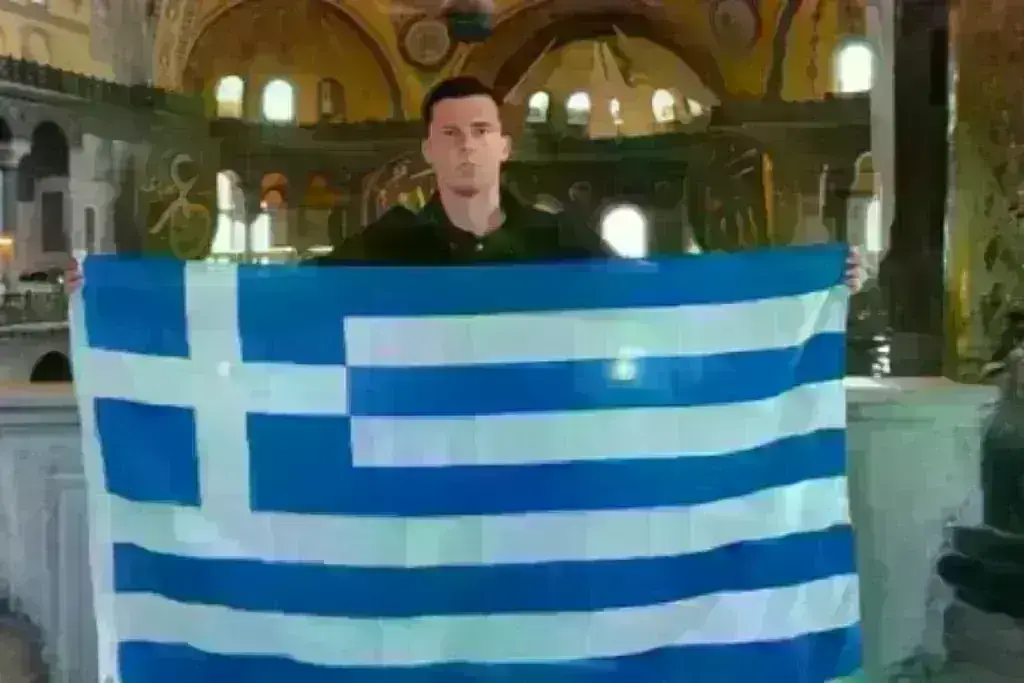 Αγιά Σοφιά: Έλληνας σήκωσε τη σημαία μέσα στον ναό και οι Τούρκοι απάντησαν με απειλές για... κολύμπι - «Αγαπημένη μου Πόλη, για πάντα ελληνική»