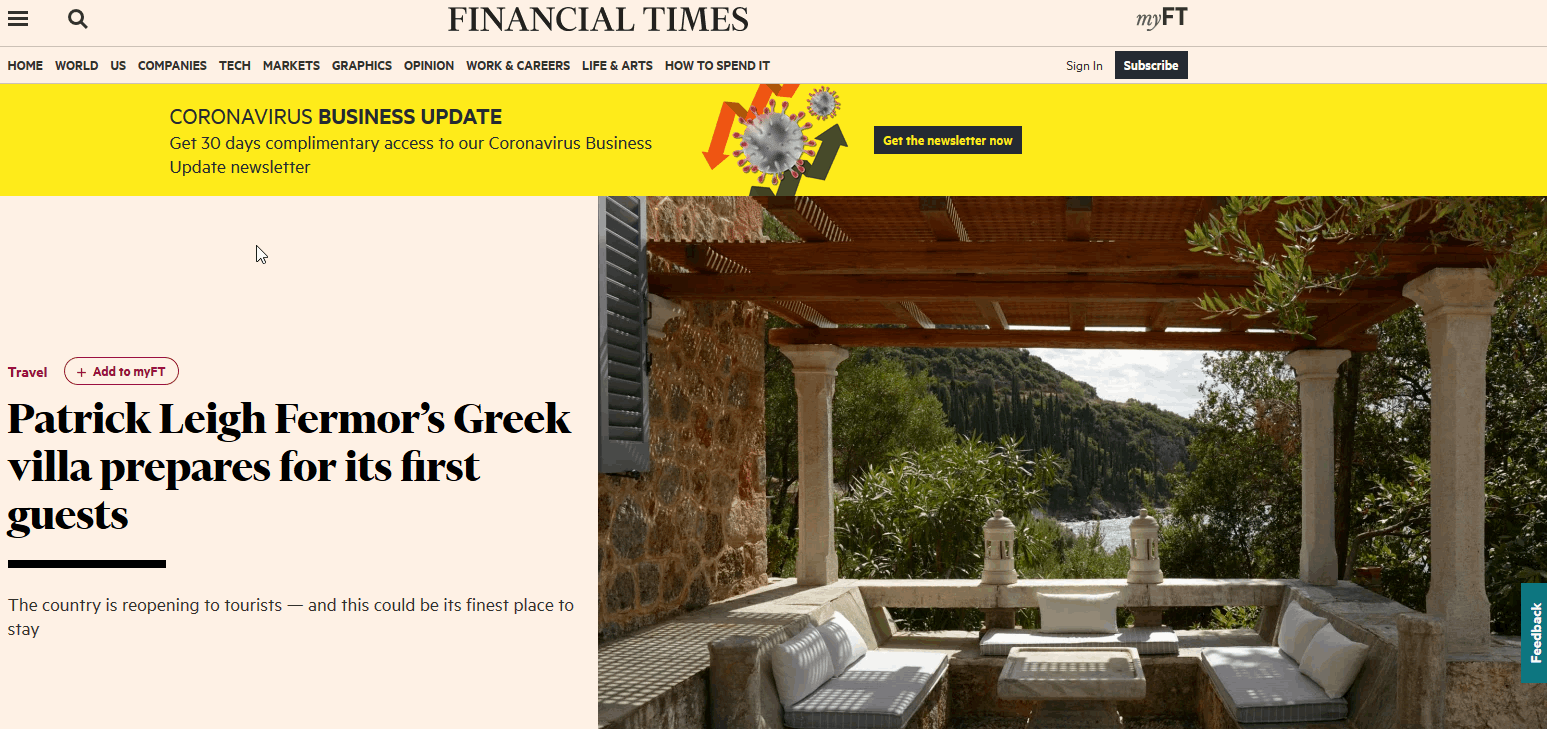 Το άρθρο με τίτλο «Η ελληνική βίλα του Πάτρικ Λι Φέρμορ ετοιμάζεται για τους πρώτους της επισκέπτες», χαρακτηρίζει την οικία του Βρετανού συγγραφέα ως «το ωραιότερο μέρος που μπορείτε να μείνετε», τονίζοντας ότι «το σπίτι είναι εξίσου φημισμένο με τον ιδιοκτήτη του».