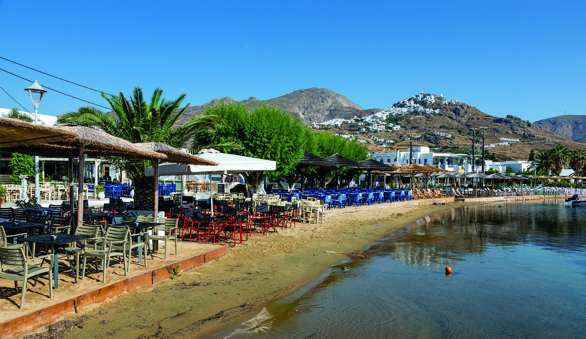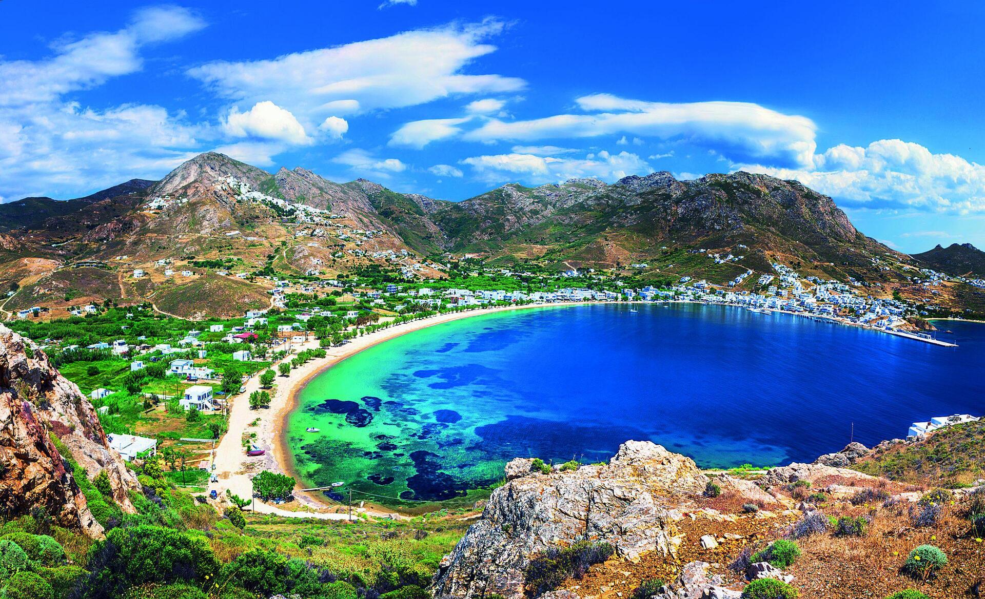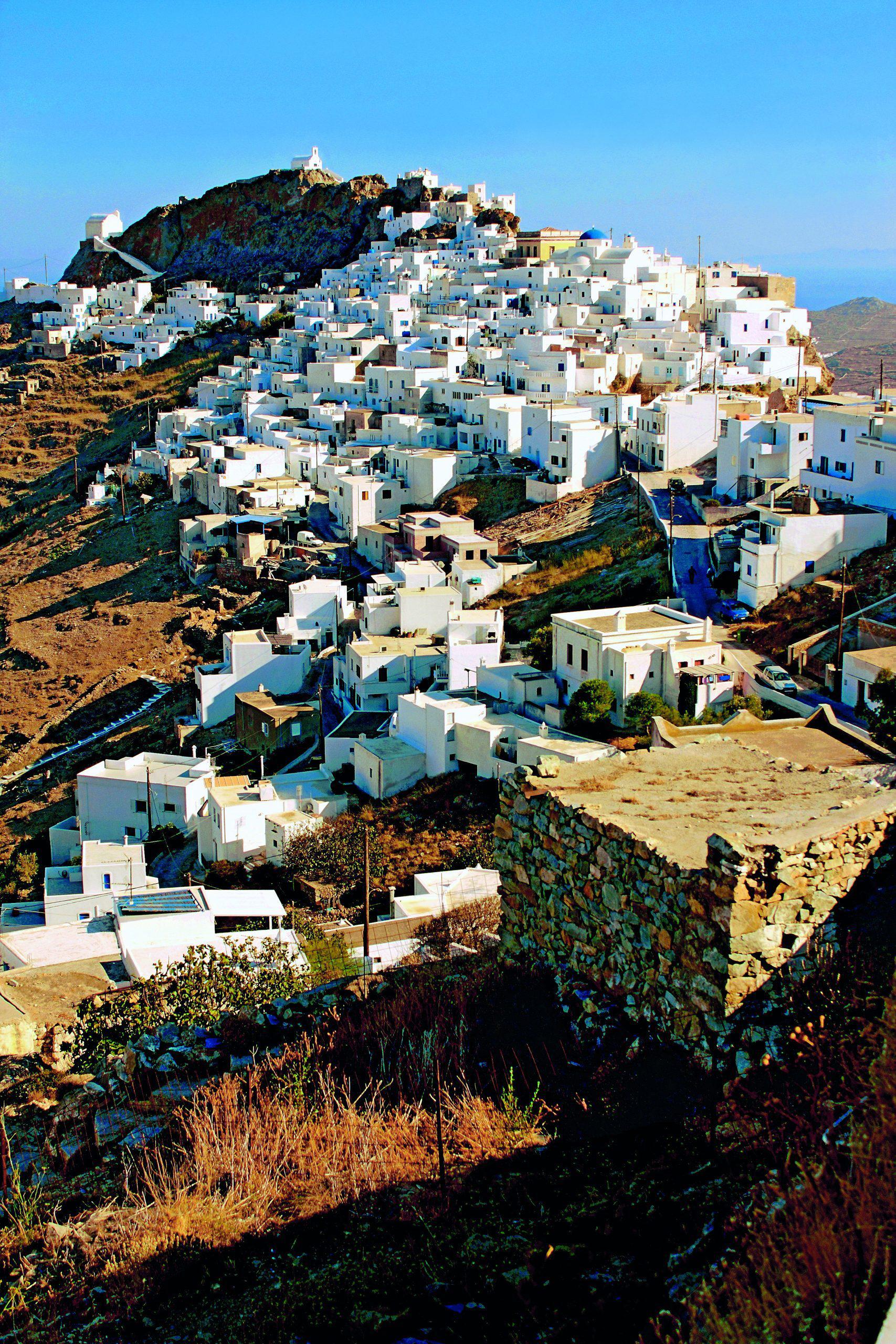 Αλλωστε, απέχει από τον Πειραιά μόλις δύο ώρες με το ταχύπλοο και περίπου πέντε ώρες με το συμβατικό πλοίο. Η θέα του από το πλοίο σού δίνει τις πρώτες συντεταγμένες του νησιού: Κυκλαδίτικο τοπίο 100%, πλαγιές χωρίς πράσινο, δαντελωτές παραλίες και μια Χώρα κάτασπρη και πανέμορφη σκαρφαλωμένη πάνω στον βράχο, με τον Αγιο Κωνσταντίνο στο ψηλότερο σημείο της να εποπτεύει από εκεί τα πάντα.