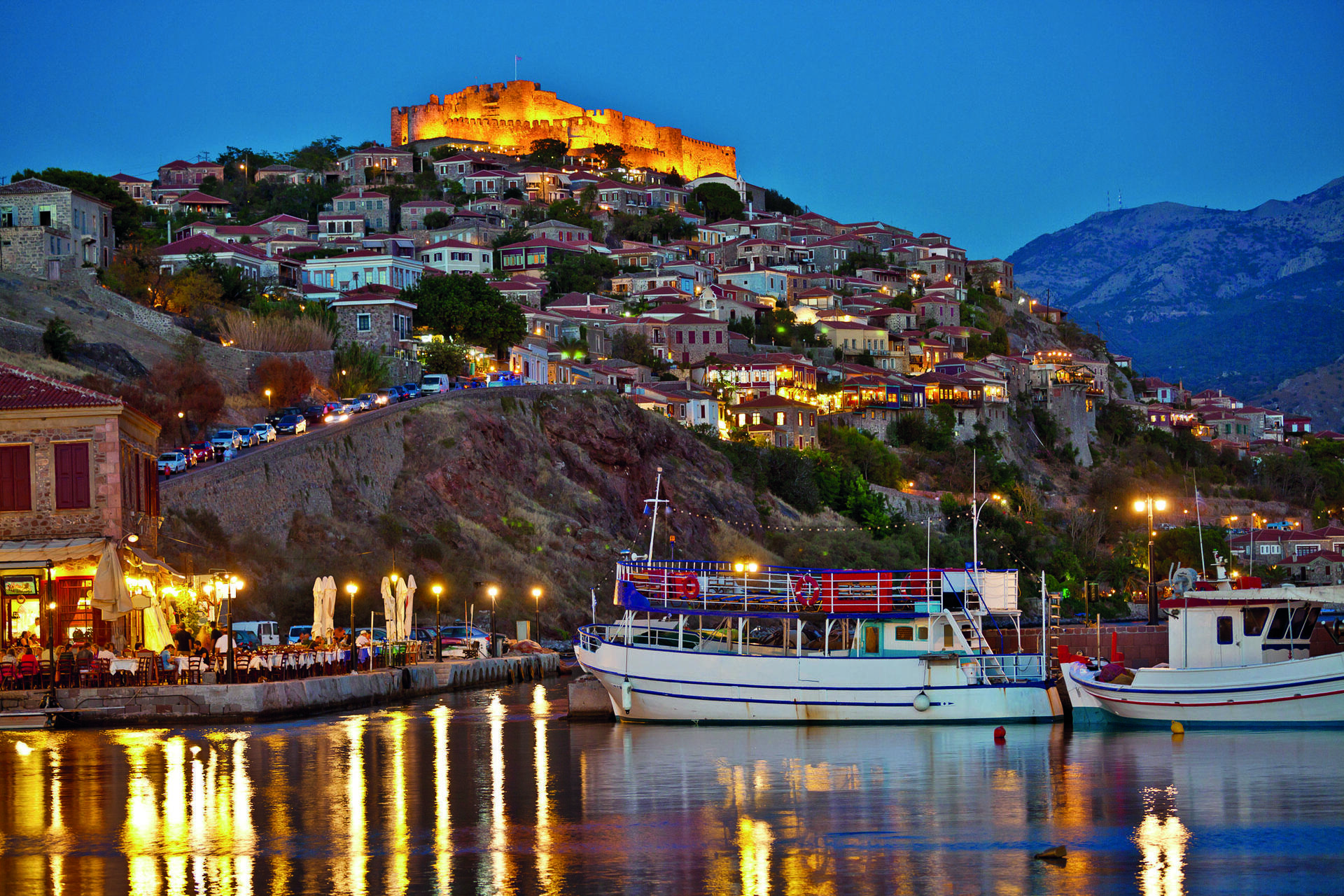 Καθίστε να φάτε στις παραδοσιακές ταβέρνες, το Φανάρι είναι η περιοχή με τα περισσότερα ουζερί, και δοκιμάστε κολοκυθοανθούς, σπεσιαλιτέ του νησιού, αλλά και αρνάκι γεμιστό, σουτζουκάκια, κρεμμυδοντολμαδάκια, κρεμμυδόπιτες, γκιουζελμέδες, σπιτικά ζυμαρικά και σαρδέλες ψημένες σε αμπελόφυλλα, από τα ωραιότερα πιάτα της λεσβιακής κουζίνας.