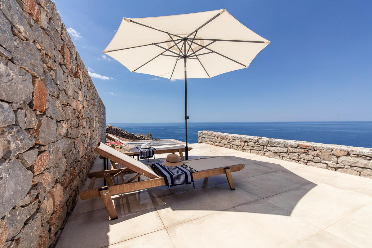 Με 16 πολυτελείς σουίτες, χτισμένες αμφιθεατρικά, όλες με θέα στη θάλασσα, προσφέρει μια εκπληκτική αίσθηση διαμονής χάρη στον εσωτερικό σχεδιασμό, ο οποίος συνδυάζει λειτουργικά την πέτρα, τους μεγάλους πολυτελείς χώρους, την ιδιαίτερη, άνετη και λειτουργική επίπλωση και συσκευές προηγμένης τεχνολογίας.