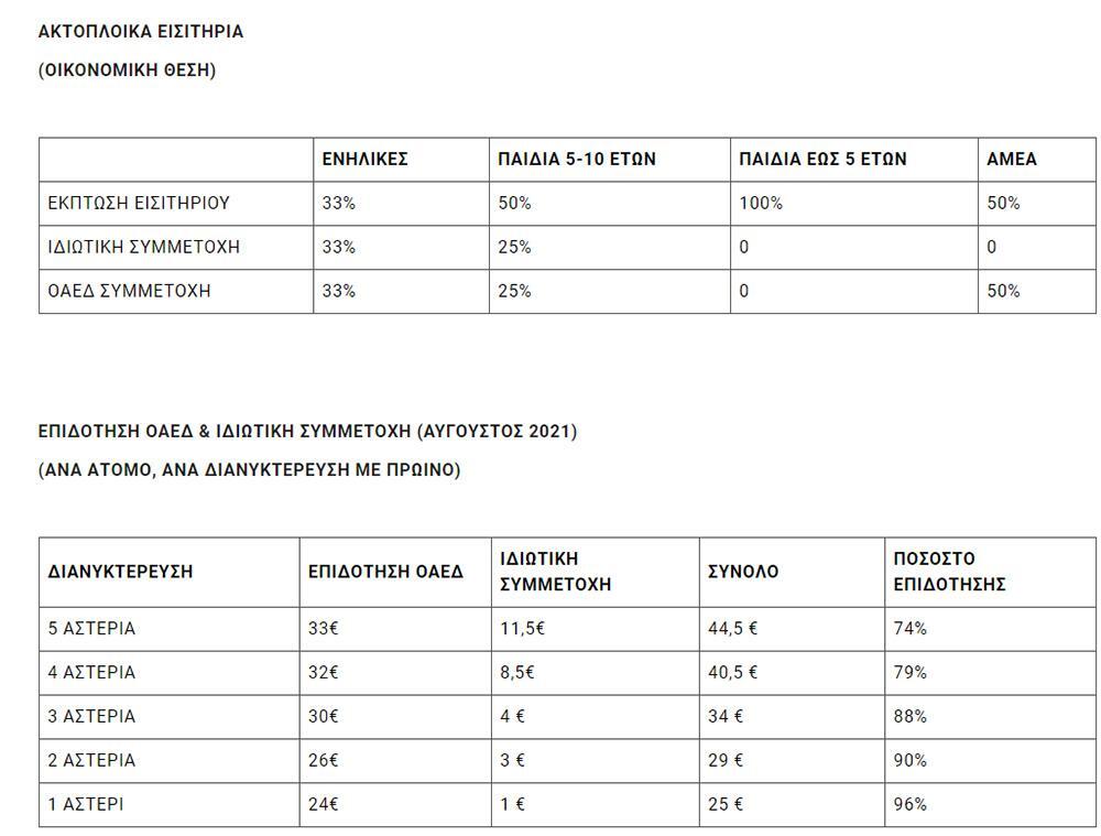 - Για τα ακτοπλοϊκά εισιτήρια (μετ’ επιστροφής) το κόστος επιμερίζεται ως εξής: