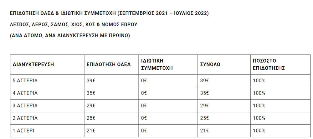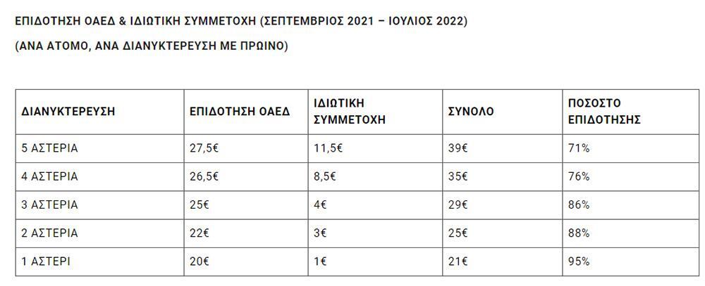 - Επιδότηση ΟΑΕΔ: 55 € (2 ενήλικες Χ 20 €, 1 παιδί 15 € +1 παιδί δωρεάν)