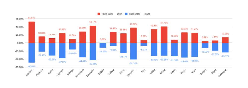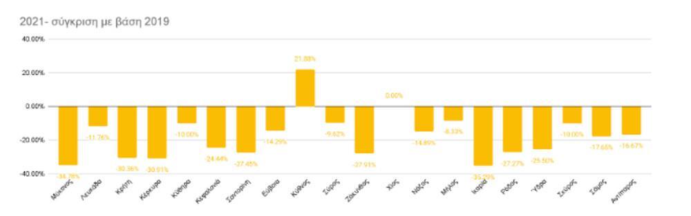 Με τις μικρότερες διακυμάνσεις να καταγράφονται στη Χίο, ήδη για το 2021 βρίσκεται στα ίδια σχεδόν επίπεδα με το 2019.