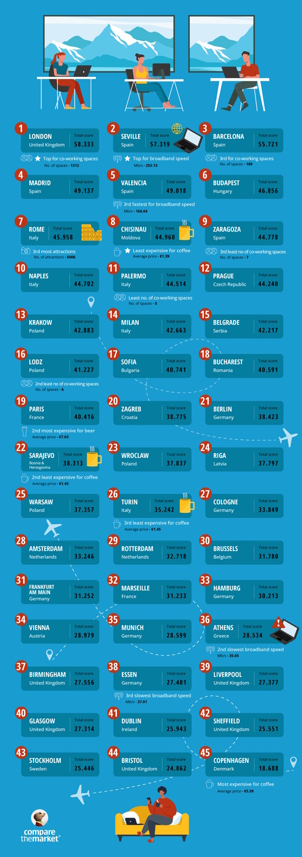 Για να βοηθήσει τους ανθρώπους να επιλέξουν την καλύτερη πόλη για να περάσουν το workation (work + vacation) τους, η Compare the Market AU ανέλυσε διάφορους παράγοντες, όπως η ευρυζωνική ταχύτητα, ο αριθμός των χώρων συνεργασίας, τα αξιοθέατα και φυσικά η τιμή του καφέ.