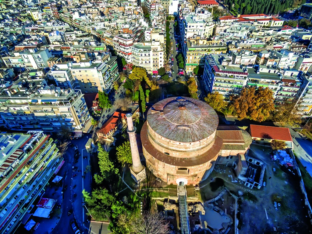 Η Ροτόντα, το εντυπωσιακό αυτό κυκλικό οικοδόμημα, βρίσκεται στον άξονα που συνδέει τη θριαμβική αψίδα του Γαλερίου με το Ανάκτορο του Γαλερίου. Εχει διάμετρο 24,5 μ. ενώ ο γιγαντιαίος τρούλος του ύψος 30 μ. Κτίστηκε το 306 μ.Χ. από τον Γαλέριο, ίσως ως ναός του Δία ή του Καβείρου ή ως μαυσωλείο του, αλλά τον 5ο αι. μετατράπηκε σε χριστιανικό ναό, αφιερωμένο στους Αγίους Ασωμάτους. Στα εξαιρετικά ψηφιδωτά (5ου αι.) που διασώζονται, εντυπωσιάζει ο πλούτος των θεμάτων, η φυσιοκρατική τους απόδοση, η ποικιλία των χρωμάτων και η λαμπρότητα των χρυσών και ασημένιων ψηφίδων. Το 1591 μετατράπηκε σε τζαμί, όταν προστέθηκε και ο επιβλητικός μιναρές που σώζεται έως σήμερα. Στην πλατεία γύρω από τη Ροτόντα βρίσκεται ο Αγιος Γεώργιος, απ’ όπου το μνημείο πήρε την άλλη ονομασία του, ενώ λειτουργούν πολλά καφέ και μπαρ. Επίσης, στην παρακείμενη οδό Μελενίκου σώζονται τμήματα του ανατολικού τείχους της πόλης.
