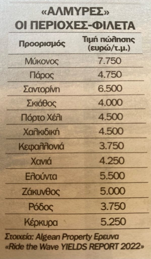 Δεν είναι τυχαίο ότι οι ελληνικοί προορισμοί έχουν τις κορυφαίες επενδυτικές αποδόσεις μεταξύ των διακεκριμένων προορισμών της Μεσογείου. Κατοικίες στην Πάρο και τη Μύκονο έχουν πολύ υψηλότερες αποδόσεις από ίδιου μεγέθους και χαρακτηριστικών οικήματα στις Κάννες, στο Σεν Τροπέ ή το Κάπρι. Τα καλύτερα παραδείγματα είναι η Μύκονος με μέση μικτή ετήσια απόδοση επένδυσης στο 7,4%, η Πάρος με 7,1% και η Σαντορίνη με 6,3%.