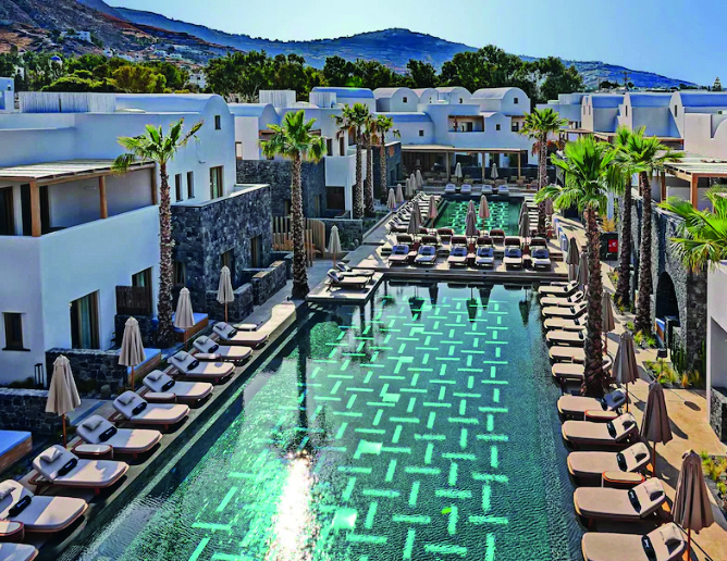 «MAGMA HOTEL»: Το «Magma Resort Santorini» μοιάζει με μια παραδοσιακή κυκλαδίτικη κατοικία ενσωματώνοντας έναν βιώσιμο αλλά μοντέρνο εξωτερικό σχεδιασμό που συμπεριλαμβάνει στοιχεία από λάβα, πέτρα, αλλά και τη γενικότερη ατμόσφαιρα του νησιού. Και τα 59 δωμάτια και σουίτες έχουν ανεμπόδιστη θέα στο Αιγαίο Πέλαγος και την Ανάφη, ενώ τα 46 διαθέτουν ιδιωτική πισίνα και υδρομασάζ. Φωλιασμένο ανάμεσα σε παραδοσιακούς παλιούς αμπελώνες, το θέρετρο βρίσκεται στις πλαγιές του Βουρβούλου, σε κοντινή απόσταση από τις γραφικές παραλίες στο βορειοανατολικό τμήμα του νησιού και δημοφιλείς κοσμοπολίτικους προορισμούς, όπως τα Φηρά και η Οία. Τη γαστρονομική εμπειρία του θερέτρου, «Magma by Spondi», θα επιμεληθεί ένας βραβευμένος σεφ με δύο αστέρια Michelin, ο οποίος και θα τιμήσει την τοπική κουζίνα. Πληροφορίες και κρατήσεις στο e-mail: info@magmaresortsantorini.com