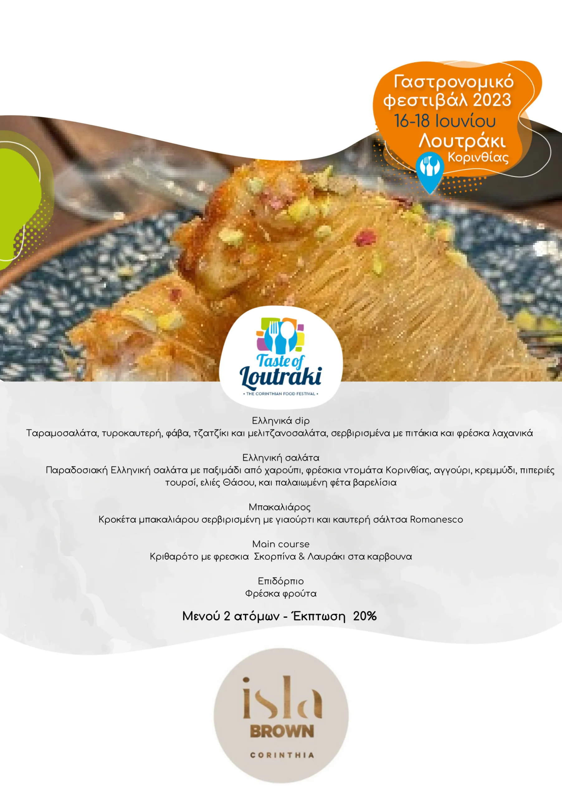 Επιπλέον, το Isla Brown Corinthia συμμετέχει στο τριήμερο φεστιβάλ (16 με 18 Ioυνίου) ανάμεσα σε περισσότερες από 40 επιχειρήσεις εστίασης και ξενοδοχείων, έχοντας δημιουργήσει για τους επισκέπτες ένα ξεχωριστό μενού με γεύσεις εμπνευσμένες από τοπικά προϊόντα της περιοχής σε ειδική τιμή (20% έκπτωση), με σκοπό την ανάδειξη και προβολή των τοπικών προϊόντων, που αποτελούν την κορωνίδα της Κορινθιακής γαστρονομίας.