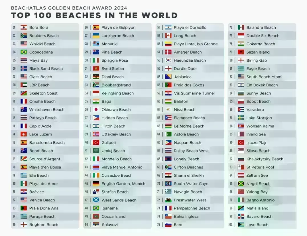Δεν υπάρχει καλύτερη στιγμή από τους μήνες της άνοιξης-καλοκαιριού για να κάνετε εξερεύνηση για την καλύτερη παραλία, προκειμένου να χαλαρώσετε στις ξαπλώστρες και να κυνηγήσετε τα κύματα. Ακριβώς στην ώρα για την επόμενη απόδρασή σας, το BeachAtlas — μια startup με έδρα το Λονδίνο που ειδικεύεται στις παγκόσμιες παραλίες — αποκάλυψε τη λίστα της Global Beach Award 2024, η οποία περιλαμβάνει τις 100 καλύτερες παραλίες στον κόσμο. Ενώ το Bora Bora της Γαλλικής Πολυνησίας κατέκτησε τη λίστα στην πρώτη θέση, η παραλία Boulder της Νότιας Αφρικής, η παραλία Waikiki της Χαβάης και η περίφημη Copacabana της Βραζιλίας ακολούθησαν από κοντά. Η διάσημη παραλία Siloso της Σιγκαπούρης στο νησί Sentosa, επίσης, έφτασε στην ανταγωνιστική λίστα, κλείνοντας στην 91η θέση.