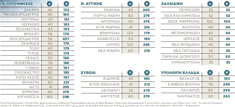Το συνολικό κόστος για 3 διανυκτερεύσεις για τετραμελή οικογένεια κυμαίνεται από 179 έως 286 ευρώ. Στη Ραφήνα κατοικία 44 τ.μ. μισθώνεται προς 240 ευρώ για το τριήμερο, στο Πόρτο Ράφτη κατοικία 60 τ.μ. προς 276 ευρώ, στην Αρτέμιδα κατοικία 40 τ.μ. προς 276 ευρώ, στην Αγία Μαρίνα κατοικία 47 τ.μ. προς 216 ευρώ, στην Ανάβυσσο κατοικία 50 τ.μ. προς 185 ευρώ και στη Νέα Μάκρη κατοικία 60 τ.μ. προς 218 ευρώ.