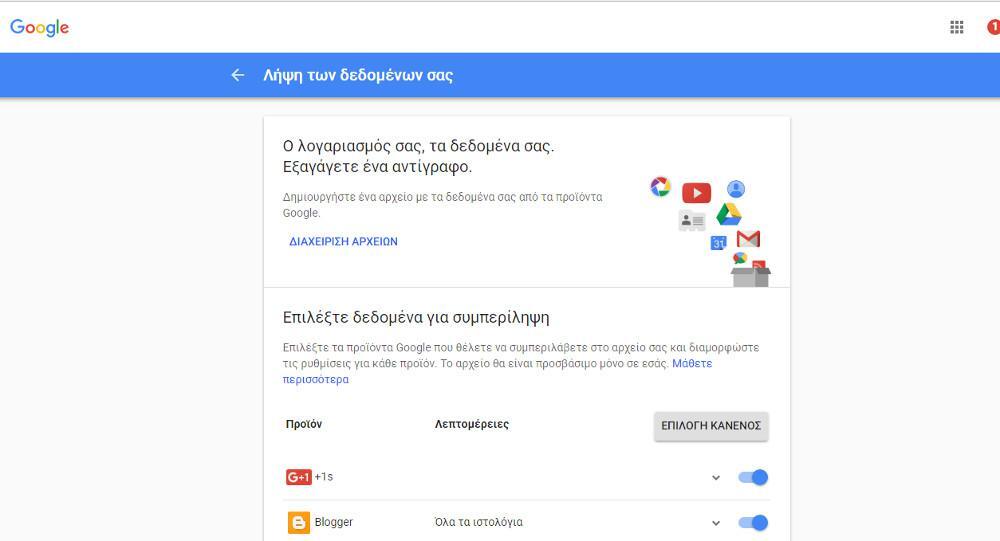 Τέλος, η Google σας προσφέρει την επιλογή να κατεβάσετε όλα τα δεδομένα που αποθηκεύει εκείνη σχετικά με εσάς. Αν λοιπόν ζητήσετε να τα κατεβάσετε, θα μείνετε έκπληκτοι με το μέγεθος του αρχείου καθώς το μέγεθός του θα ξεπερνά τα 2-3 GB! Όχι MB, GB! Και εκεί υπάρχουν όλα: το Calendar σας, τα Google Hangout σας, το ιστορικό τοποθεσίας σας, η μουσική που ακούτε, τα βιβλία που έχετε αγοράσει, τα chats που βρίσκεστε, τα sites που έχετε δημιουργήσει, τα τηλέφωνα που έχετε στην κατοχή σας, τα share που έχετε κάνει στο Internet, ακόμα και πόσα βήματα περπατάτε μέσα σε μια μέρα! Κυριολεκτικά όλη η ζωή σας! Κατεβάστε το δικό σας εδώ.