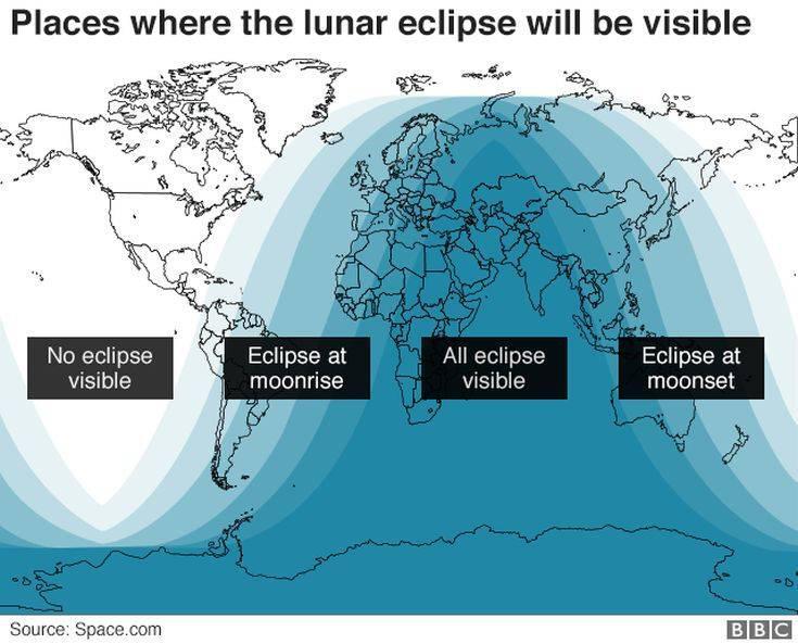 Το βαθυκόκκινο χρώμα που θα πάρει κάποια στιγμή οφείλεται στη σκιά της Γης που μπλοκάρει το φως του ήλιου. Το σπάνιο αυτό φαινόμενο θα είναι ορατό σχεδόν σε όλη τη Γηραιά Ήπειρο, την Ασία, την Αυστραλία, την Αφρική και κάποια μέρη της Λατινικής Αμερικής.