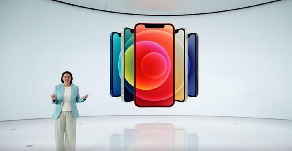 Το πρώτο iPhone που παρουσιάστηκε ήταν το iPhone 12 με επίπεδες πλευρές στα πρότυπα του iPad Pro και προσφέρεται σε πέντε χρώματα. Διαθέτει Super Retina XDR οθόνη 6.1 ιντσών με 2.000.000:1 λόγο αντίθεσης με τα διπλάσια pixels από το iPhone 11 προσφέροντας μεγαλύτερη ανάλυση. Η φωτεινότητα αυξήθηκε στα 1200nits. Το γυαλί της οθόνης προστατεύεται από κεραμική ασπίδα που αναπτύχθηκε σε συνεργασία με την Corning και η Apple υποστηρίζει πως είναι πιο ανθεκτικό από οποιοδήποτε γυαλί σε smartphone.