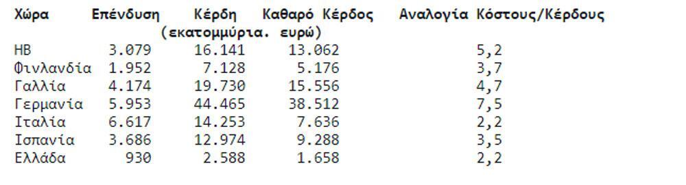 Σύμφωνα με τα ευρήματα της έκθεσης, η Γερμανία είναι η ευρωπαϊκή χώρα με το μεγαλύτερο προβλεπόμενο καθαρό όφελος (όφελος μείον κόστος) ύψους 38,5 δισ. ευρώ, με μια επένδυση ύψους 6 δισ. ευρώ, κάτι το οποίο μας δίνει μια αναλογία κόστους-οφέλους (cost-benefit-ratio, CBR) της τάξης του 7,5. Η Ελβετία, από την άλλη πλευρά, αναμένεται να έχει την υψηλότερη αναλογία κόστους-οφέλους (CBR) στην Ευρώπη, ύψους 14,7, με ένα καθαρό κέρδος 10 δισ. ευρώ έναντι μιας επένδυσης μόλις 700 εκατ. ευρώ.