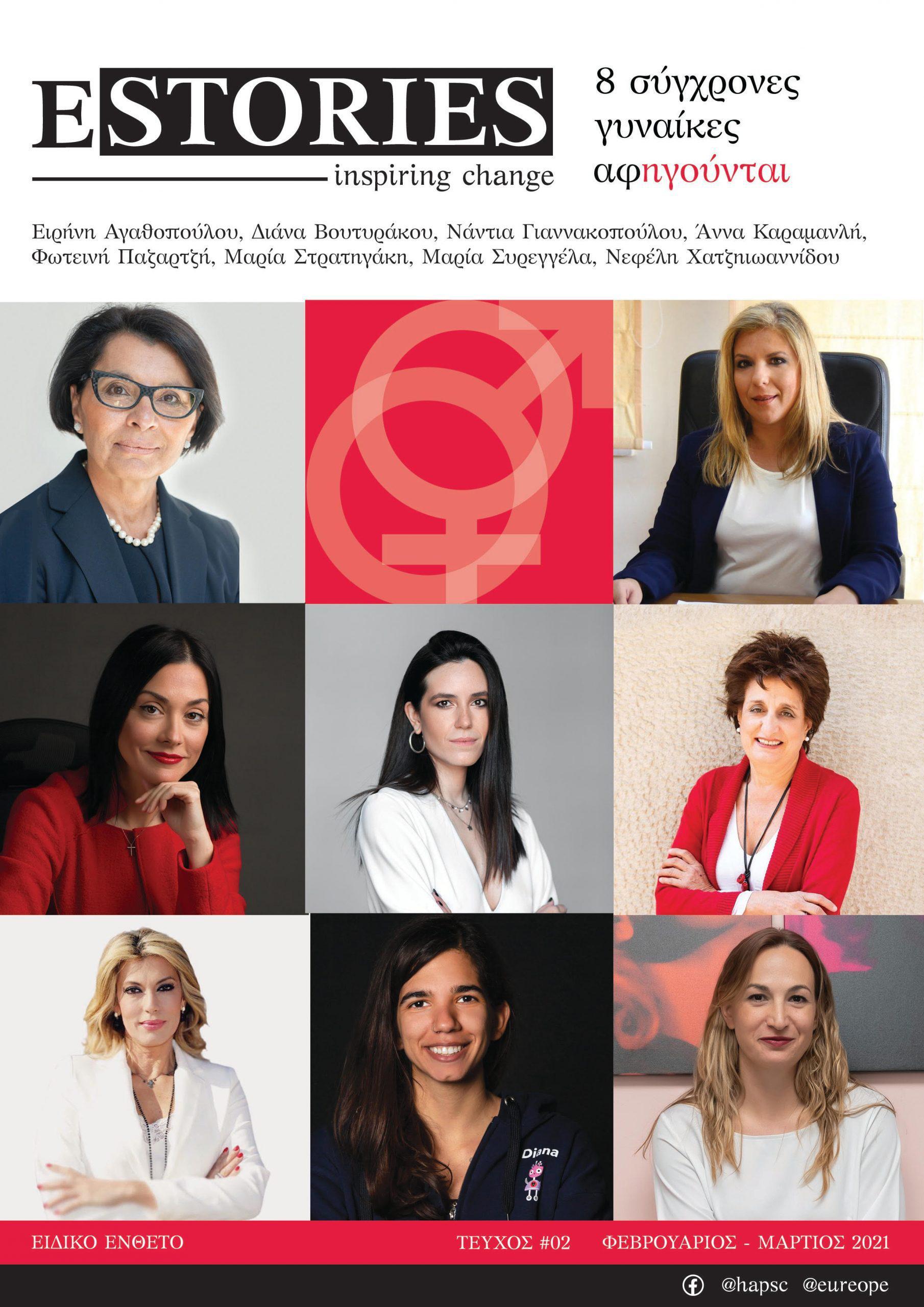 Η ισότητα των φύλων αποτελεί κεντρική θεματική και του πρώτου ειδικού ένθετου “ESTORIES: inspiring change”, που συνοδεύει το τρέχον τεύχος. Βασισμένο στην άποψη ότι η ενίσχυση της ευαισθητοποίησης για τις έμφυλες διακρίσεις είναι αποτέλεσμα διαρκούς και πολυδιάστατης συζήτησης, το συνοδευτικό ένθετο συγκεντρώνει 8 συνεντεύξεις γυναικών, 8 προσωπικοτήτων, που προέρχονται από διάφορους επαγγελματικούς χώρους. Κάθε μία παραθέτει, με γνώμονα τα προσωπικά της βιώματα, την άποψη της για την ισότητα των φύλων στην χώρα μας, τόσο διαχρονικά όσο και αναφορικά με την επικαιρότητα. Συγκεκριμένα, το εν λόγω ένθετο φιλοξενεί συνεντεύξεις από τις (με σειρά εμφάνισης στο εξώφυλλο):