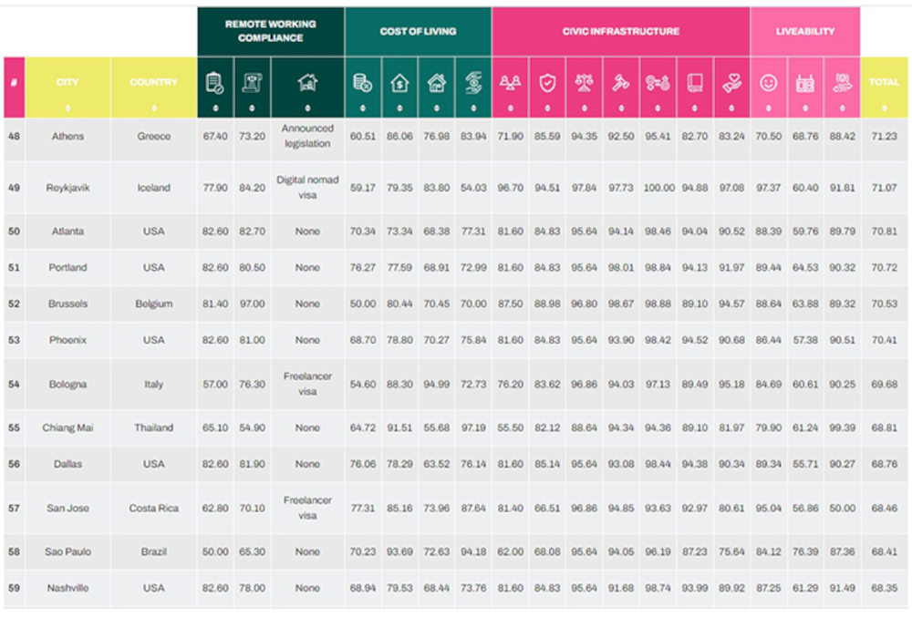 Η ελληνική πρωτεύουσα με βαθμολογία 71,23 στην κλίμακα του 100, κατατάσσεται στην 48η θέση ανάμεσα στους 80 προορισμούς παγκοσμίως, που πληρούν τα κριτήρια, τα οποία αναζητούν οι ψηφιακοί νομάδες.
