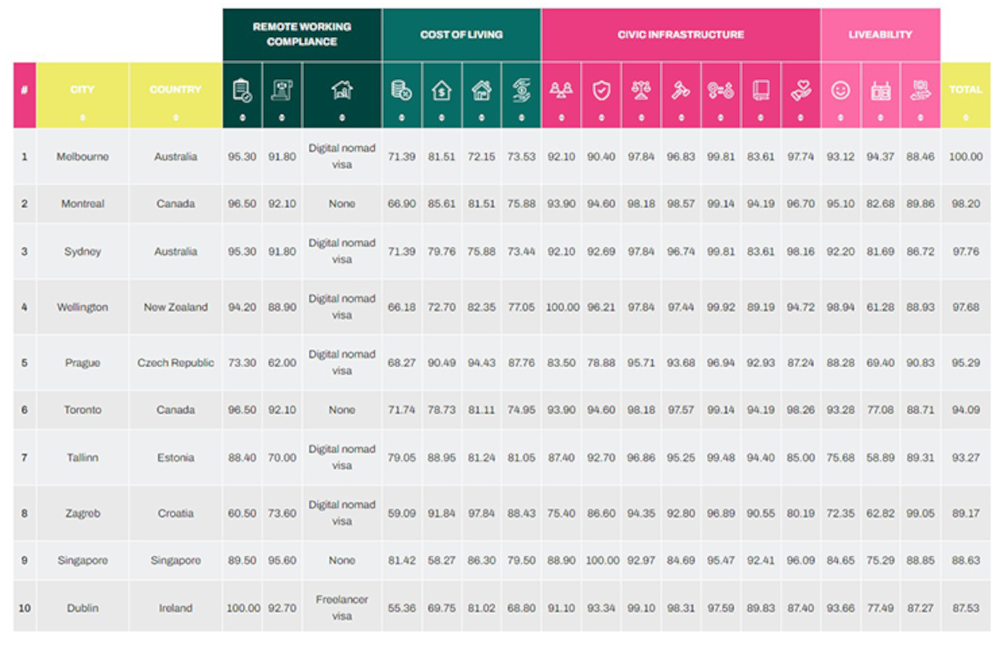 Η Μελβούρνη είναι η πόλη με την υψηλότερη κατάταξη στον δείκτη, με καλή βαθμολογία για τους παράγοντες συμμόρφωσης στην απασχόληση, την ευτυχία των πολιτών και την ύπαρξη digital nomads visa. Το Μόντρεαλ και το Σίδνεϋ ακολουθούν στη δεύτερη και τρίτη θέση αντίστοιχα.