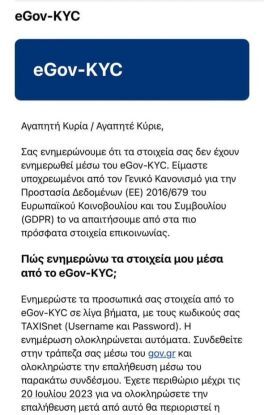 Tο ψευδές αυτό e-mail προσομοιώνει αίτημα από την υπηρεσία eGov- KYC, ζητώντας στοιχεία επικοινωνίας από τον πολίτη.