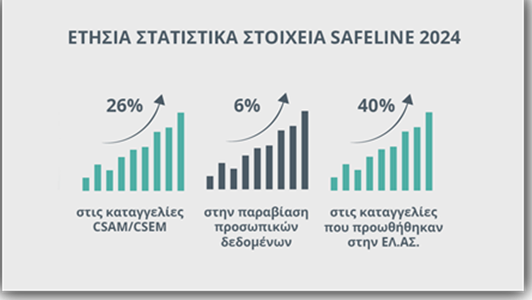Στην Ελλάδα, κατά το 2024, οι καταγγελίες για υλικό παιδικής κακοποίησης και εκμετάλλευσης και για οικονομικές απάτες αντιστοιχούσαν στο 77% του συνόλου των αναφορών που έλαβε η SafeLine.gr. Ειδικότερα, οι καταγγελίες για CSAM/CSEM υλικό σημείωσαν αύξηση 26% σε σχέση με το 2023, γεγονός που καταδεικνύει την αυξανόμενη ανησυχία των χρηστών και την ετοιμότητα της SafeLine να ανταποκρίνεται αποτελεσματικά.