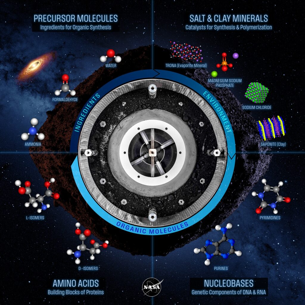 Αναλύοντας τα δείγματα αυτά, τα οποία είναι τα πρώτα δείγματα από την επιφάνεια αστεροειδούς που έλαβε η NASA στο Διάστημα και τα μοναδικά που συλλέχθηκαν από πλανητικό σώμα εδώ και σχεδόν 50 χρόνια μετά τις αποστολές Apollo, οι ερευνητές βρήκαν χιλιάδες οργανικές μοριακές ενώσεις. Οι ενώσεις αυτές περιλάμβαναν 14 από τα 20 πρωτεϊνικά αμινοξέα που υπάρχουν στις μορφές ζωής της Γης, 19 μη πρωτεϊνικά αμινοξέα που είναι σπάνια ή απουσιάζουν από τη βιολογία και όλες τις πέντε βιολογικές νουκλεοβάσεις (αδενίνη, κυτοσίνη, γουανίνη, θυμίνη και ουρακίλη).