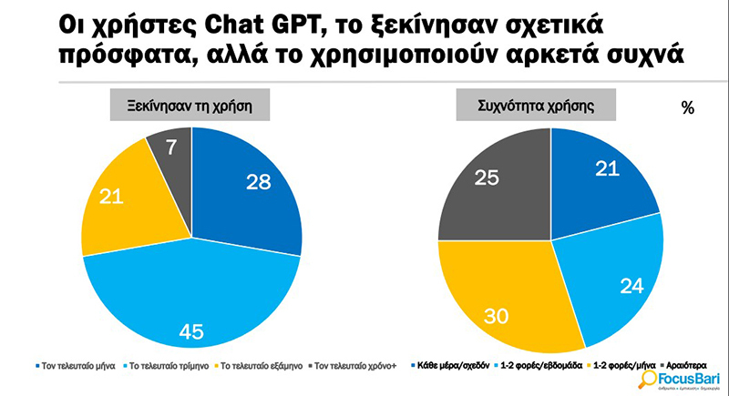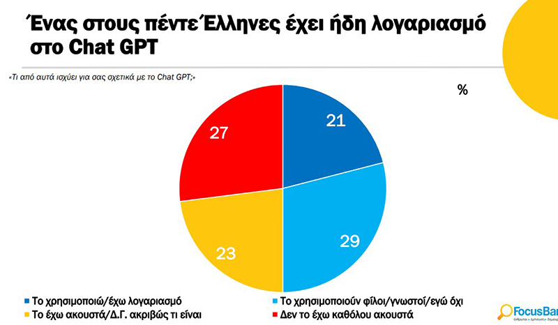 «Τον τελευταίο καιρό μια νέα πλατφόρμα τεχνητής νοημοσύνης, το chat GPT, έχει κάνει την εμφάνιση της, με πολλούς να επαινούν τα οφέλη της ενώ άλλους να ανησυχούν για το πως τέτοιες νέες τεχνολογίες θα επηρεάσουν τη ζωή, την καθημερινότητα, αλλά και την ίδια την ανθρωπότητα» αναφέρει έρευνα της Focus Bari (Οι Έλληνες & το Chat GPT), που πραγματοποιήθηκε τον Ιούλιο του 2023.