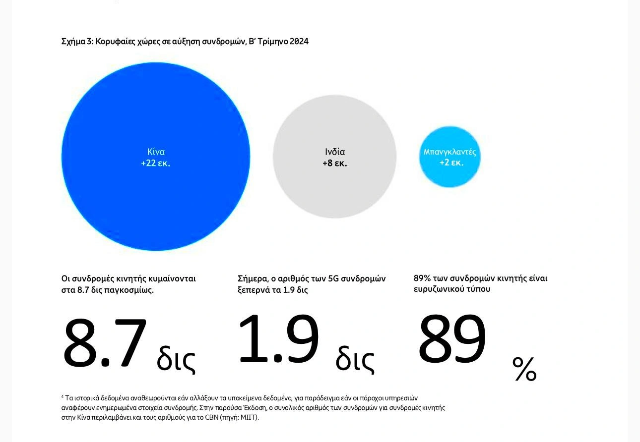 Ειδικότερα σύμφωνα με τα συμπεράσματα του Ericsson Mobility Report (τριμηνιαία έκδοση της Έκθεσης Κινητικότητας) κατά τη διάρκεια του δευτέρου τριμήνου του 2024, ο συνολικός αριθμός συνδρομών κινητής τηλεφωνίας σε διεθνές επίπεδο ανήλθε σε 8,7 δισεκατομμύρια, αυξημένος κατά 60 εκατομμύρια σε σύγκριση με το προηγούμενο τρίμηνο. Η χώρα με τη μεγαλύτερη αύξηση ήταν η Κίνα (+22 εκατ.), ακολουθούμενη από την Ινδία (+8 εκατ.) και το Μπανγκλαντές (+2 εκατ.)