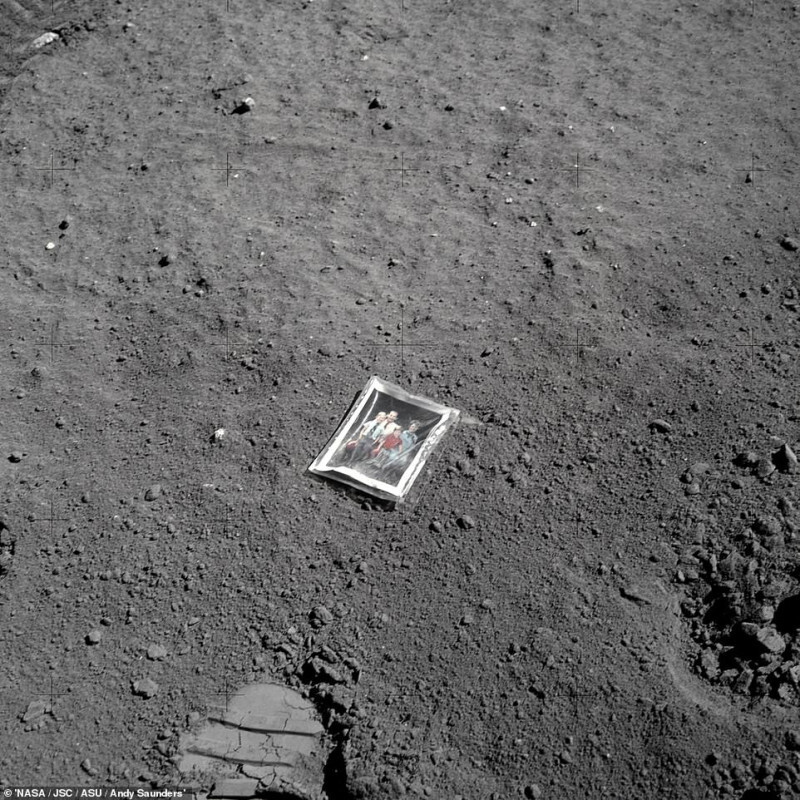 Ο αστροναύτης Τσαρλς Ντιούκ αφήνει μια φωτογραφία της οικογένειάς του στην επιφάνεια της Σελήνης, με το αποτύπωμά του να φαίνεται καθαρά ακριβώς δίπλα. Στο Στο πίσω μέρος της φωτογραφίας έγραψε: «Αυτή είναι η οικογένεια του αστροναύτη Duke από τον πλανήτη Γη. Προσγειώθηκε στη Σελήνη, Απρίλιος 1972 ».
